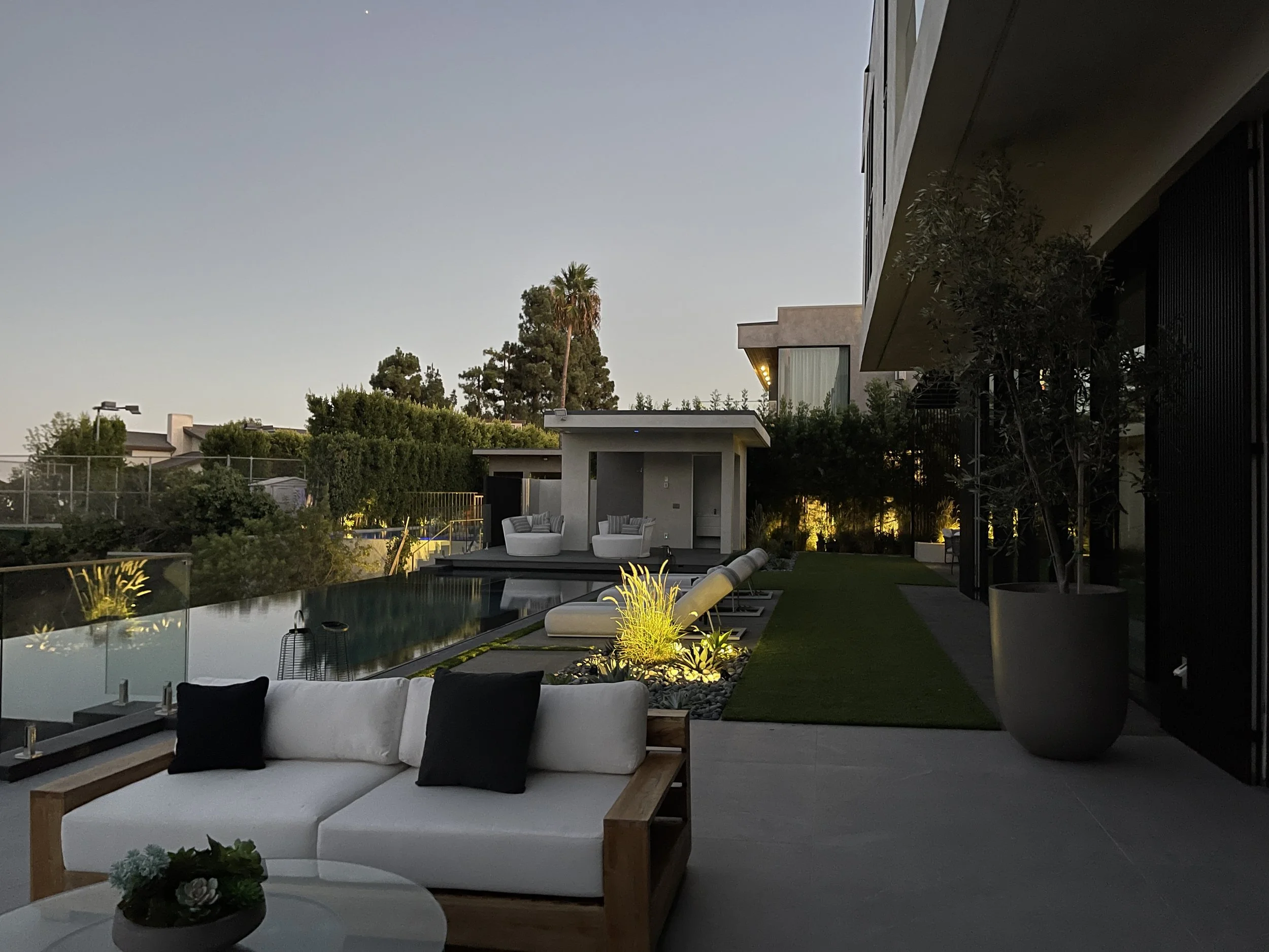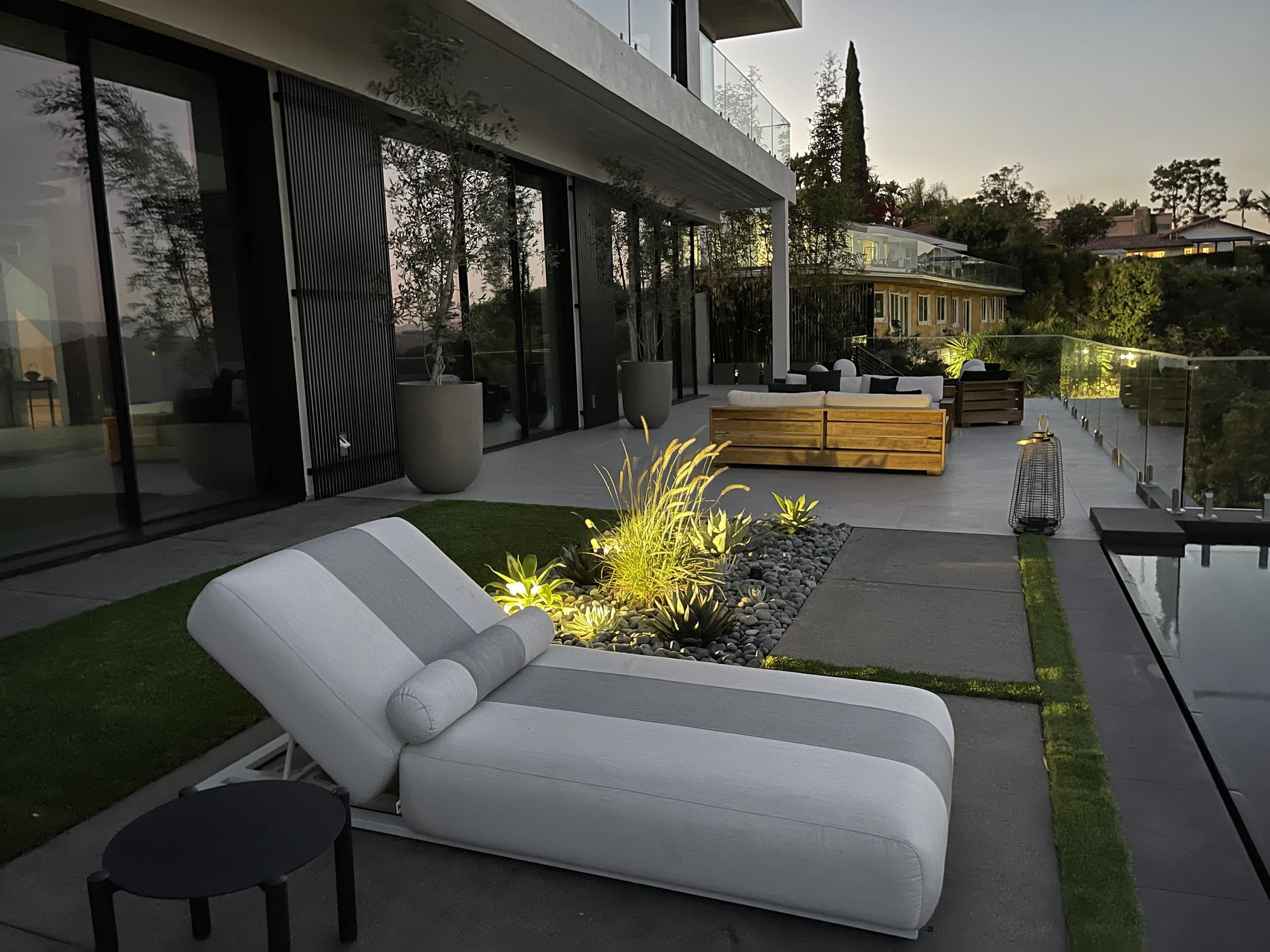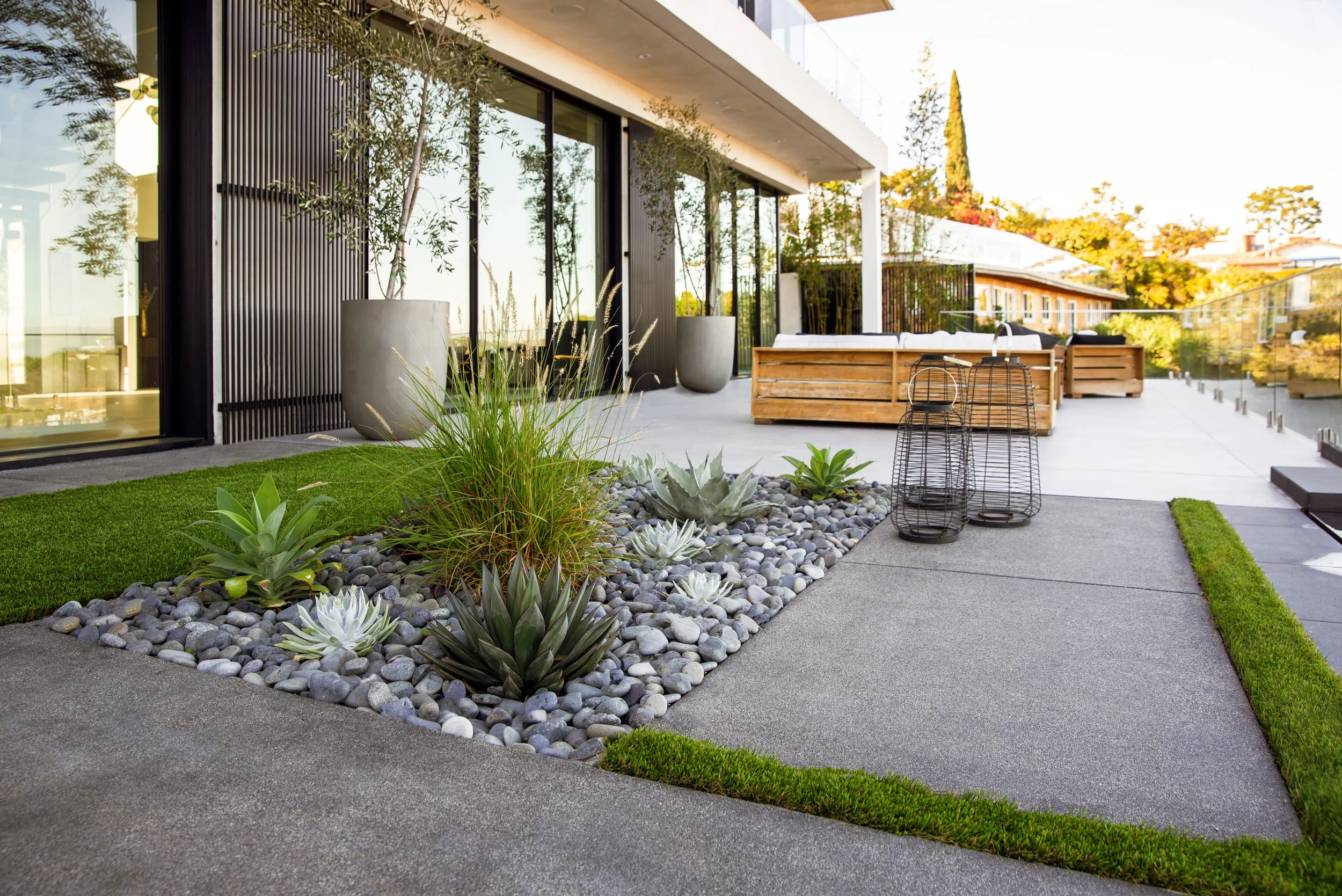 This contemporary garden was thoughtfully designed to balance clean lines with natural beauty. A planting palette centered on structural agaves and cacti, contrasting with soft grasses and olive trees, creates a modern design while also being well-suited to the climate. Materials were chosen for their rich, understated tones, such as black river rocks, stained concrete, and tile.